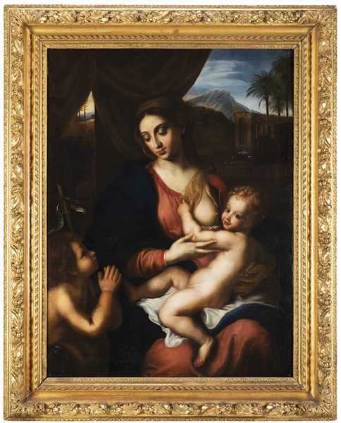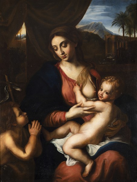 Scuola romana del secolo XVIII Madonna con Bambino e San Giovannino Olio su te