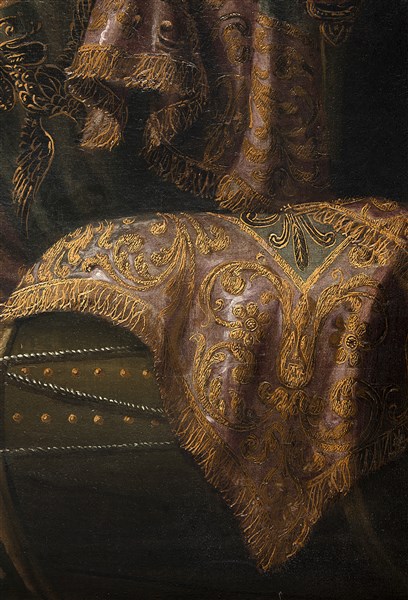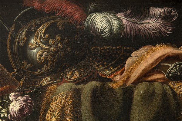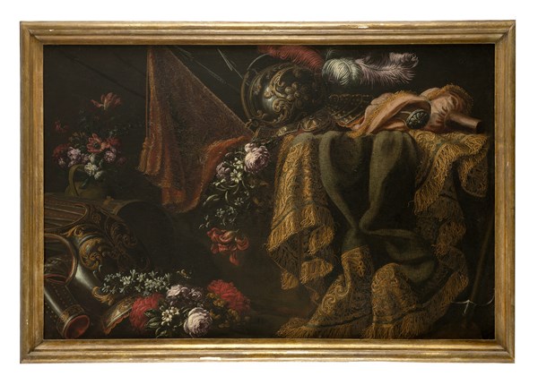 Francesco Noletti (attr.) Natura morta con tappeto, stendardo, armatura e fiori