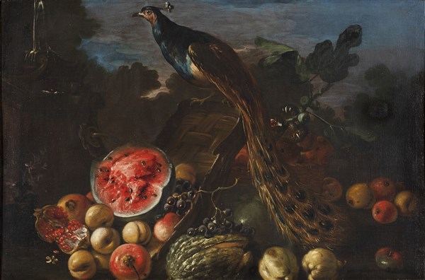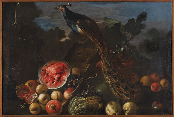 Composizione con frutta e pavone all'aperto