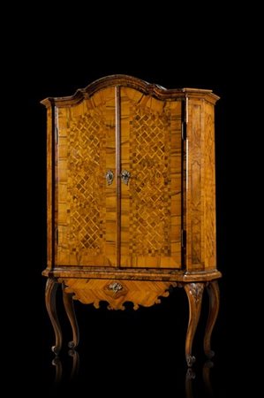 Mobile a due corpi di forma mossa lastronato in radica di noce e intarsiato in legni chiari. Due ante sul fronte tra lesene sopra un cassetto di linea spezzata. Gambe mosse intagliate all'attacco, piedi a ricciolo. Germania, secolo XIX (cm 137x200x45)
