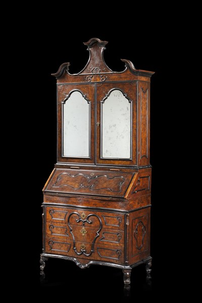 Trumeau lastronato di forma mossa in noce e radica di noce con profili ebanizzati. Parte inferiore a tre cassetti con calatoia, parte superiore a due ante a specchio, cimasa di linea spezzata e piedi a ricciolo. Lombardia, secolo XVIII (cm 110x259x58) (difetti, restauri, mancante dello scarabattolo)