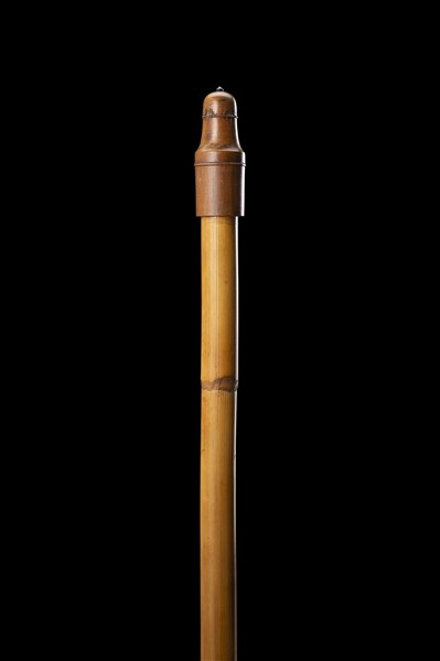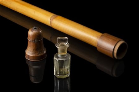 Bastone in bambù con presa e coperchio tornito celante porta essenze. Inizio secolo XX (L. cm 91) ��
