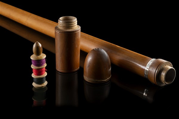 Bastone da sarto in malacca con pomolo svitabile celante ago e filo (L. cm 90)