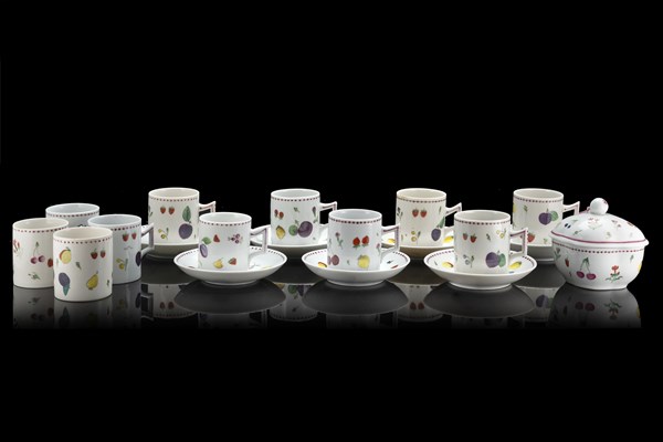 Manifattura del secolo XIX. Lotto composto da nove tazzine e altre due diverse, sette piattini ed una zuccheriera di forma mossa con coperchio in porcellana decorata in policromia con frutta, profilati in manganese (difetti e restauri)