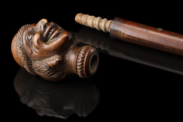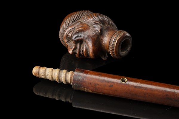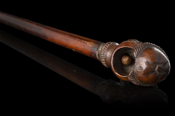 Bastone in malacca con passa laccio e presa intagliata a volto maschile con sch