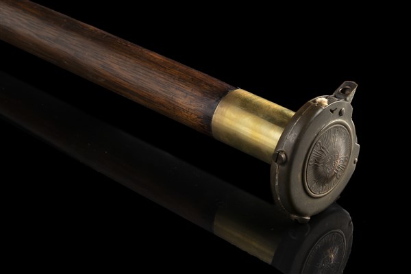Bastone in malacca con un accendino di forma circolare nel pomolo e ghiera in ottone. Puntale in metallo. Marcato "AUSR". Austria, inizio secolo XX (L. cm 92)