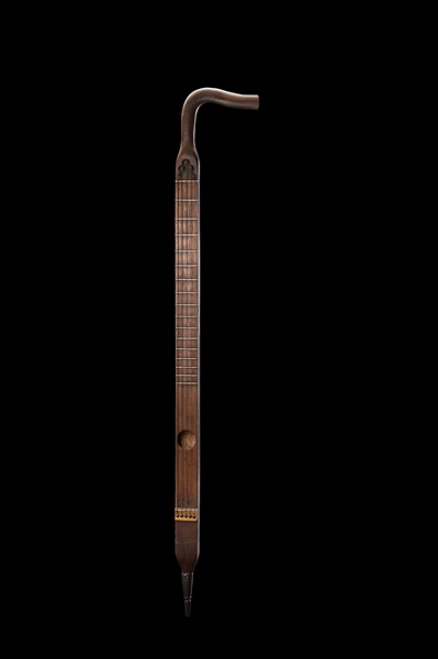 Bastone "da musicista" in malacca con presa in ferro con fisarmonica. Puntale in metallo. Inizio secolo XX (L. cm 94)