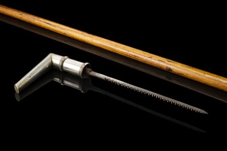 Bastone animato in rovere con presa in metallo argentato celante un seghetto a