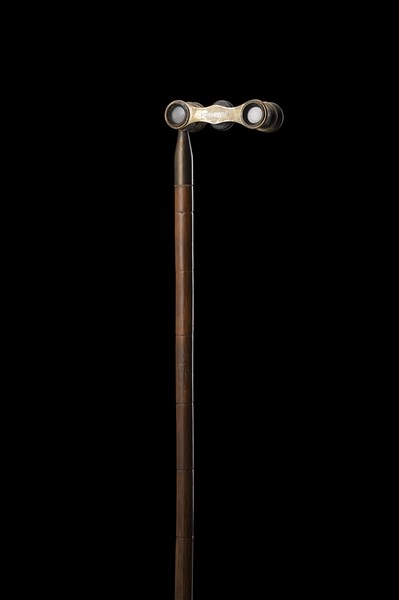 Bastone in mogano con un binocolo in ottone all'impugnatura. Marcato Pomponette. Secolo XIX (L. cm 92)