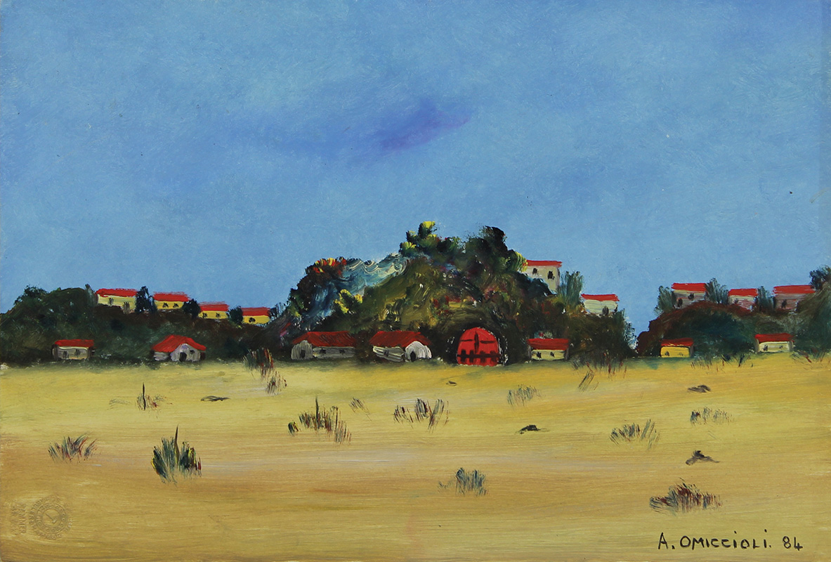 Omiccioli Alfonso Baracche in periferiferia, 1984 olio su cartone, cm 25,5x36,5 firmato e datato in basso a destra, firmato, intitolato e datato al retro