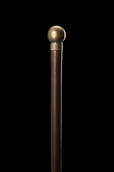 Bastone da passeggio in legno con pomolo in ottone di forma sferica celante peso a piombo. Puntale in metallo. Secolo XIX (L. cm 95)