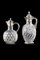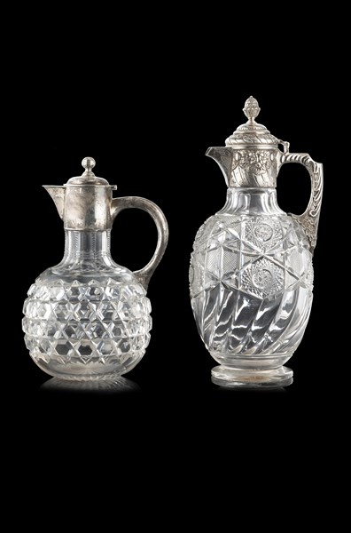 Lotto composto da due bottiglie in cristallo con coperchi e anse in argento, punzoni inglesi (h. max cm 31) (difetti)