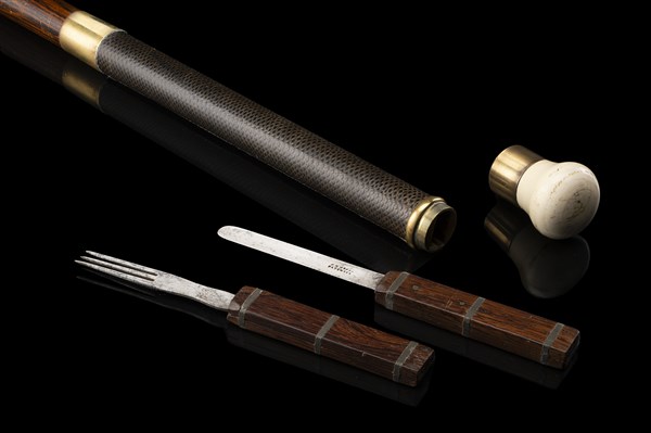 Bastone "da picnic" in faggio con presa in avorio tornito celante un coltello ed una forchetta in acciaio con manico in legno. Ghiere in ottone e presa leggermente rivestita in pelle. Secolo XIX (L. cm 91)