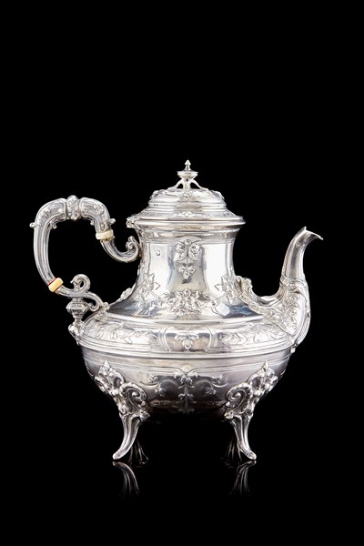 Teiera in argento sbalzato e cesellato a ghirlande di fiori. Presa del coperchio a trottola, ansa e piedini mossi. Francia, secolo XIX/XX. Argentiere Henry Soufflot (h. cm 15) (g 300)