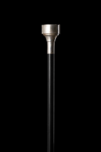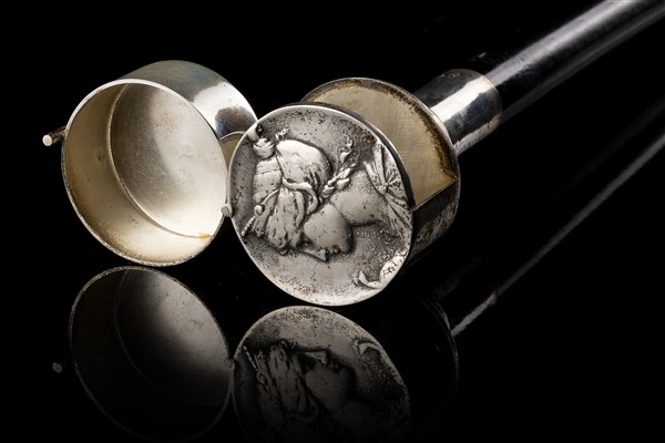 Bastone da signora in legno ebanizzato con presa in argento apribile e celante