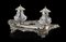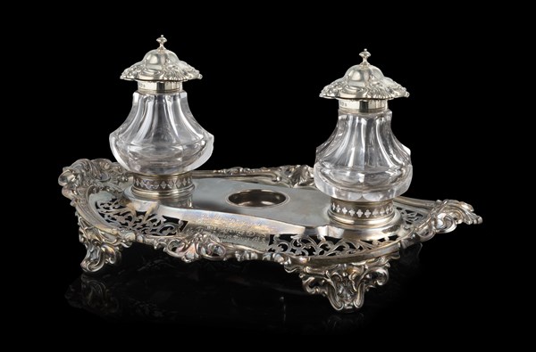 Calamaio in argento di forma mossa, traforato a volute e girali vegetali e dedicato. Ampolle in cristallo e piedini a ricciolo. Punzoni di Sheffield, 1854. Argentiere Henry Wilkinson & Co (cm 34,5x5,3) (g netti 660)