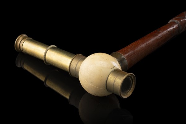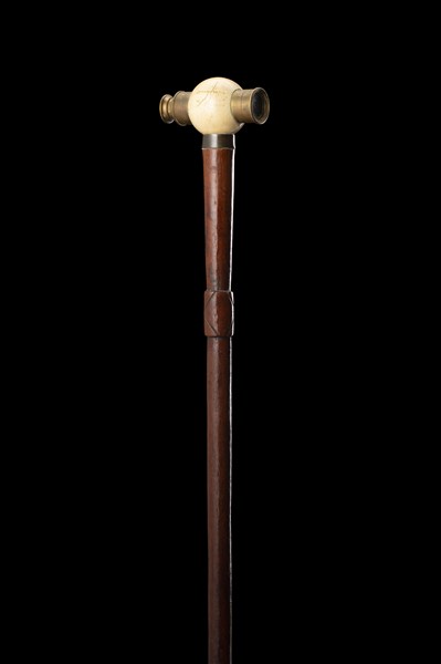 Bastone in palissandro con presa in avorio tornito e cannocchiale da teatro in ottone. Secolo XIX (L. cm 87) (difetti)��