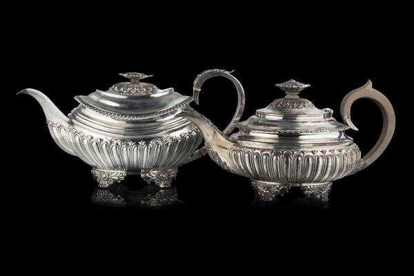 Lotto composto da due teiere in argento di simil decoro, a corpo bombato e scanalato a baccellature nella vasca. Presa dei coperchi a bottone sbalzato a fiore in rilievo, ansa a voluta, una in legno e piedini ferini. Londra, 1822. Argentiere William Traies (h. max cm 16) (g lordi 1460) (lievi difetti)