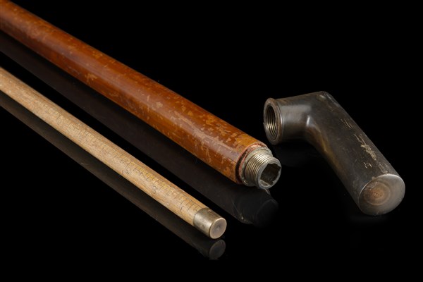 A malacca tailor walking stick with a horn handle hiding a wooden measuring rod. Metal toe cap (L. cm 95)