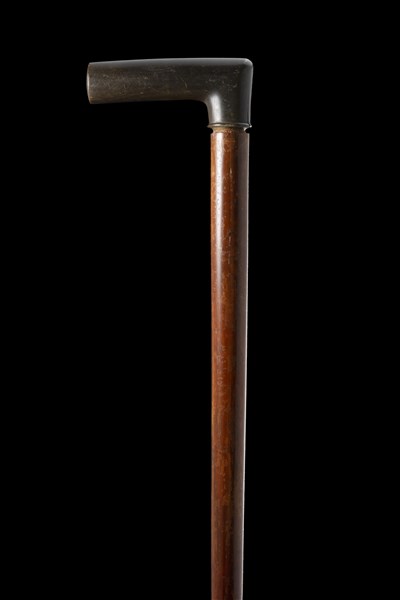 Bastone da sarto in malacca con presa in corno celante bacchetta dei centimentri in legno. Puntale in metallo (L. cm 95)