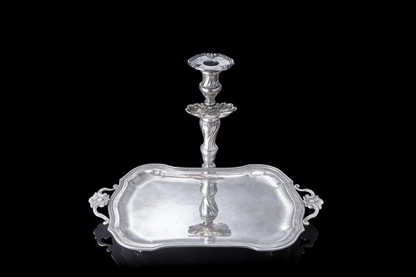Portacandela con vassoio biansato e sagomato in argento. Titolo 800. Genova. Ar