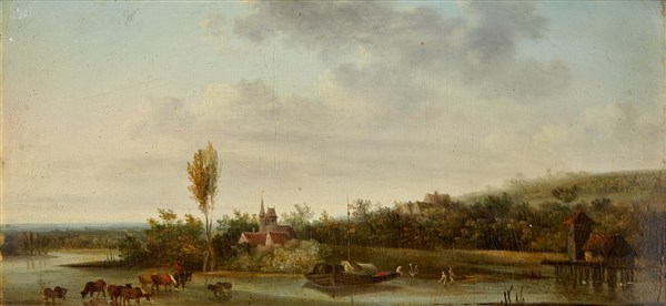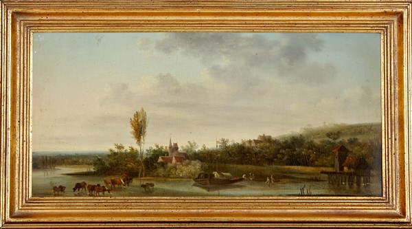 Paesaggio fluviale con pastore, armenti, barca e chiesa sullo sfondo