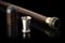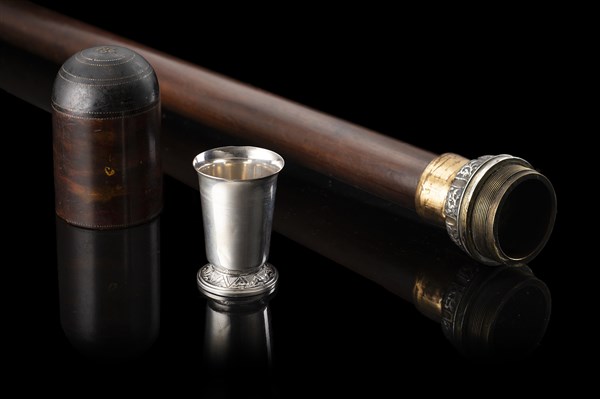 Bastone in palissandro con presa in tartaruga intarsiata a motivi stilizzati e ghiera in argento celante un bicchierino in argento a corpo liscio con titolo 830. Russia (?) Fine secolo XIX (L. cm 90)