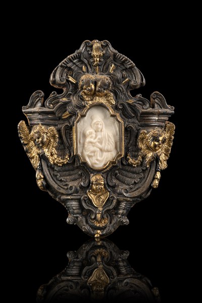 Cornice in argento con teste di cherubini e dettagli dorati. Al centro placca in osso intagliato raffigurante Madonna con Bambino (cm 13x10)