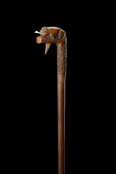 A 19th-century French wooden walking stick with frog shaped handle. Openable mouth with ivory tongue as scarf holder (L. cm 93)