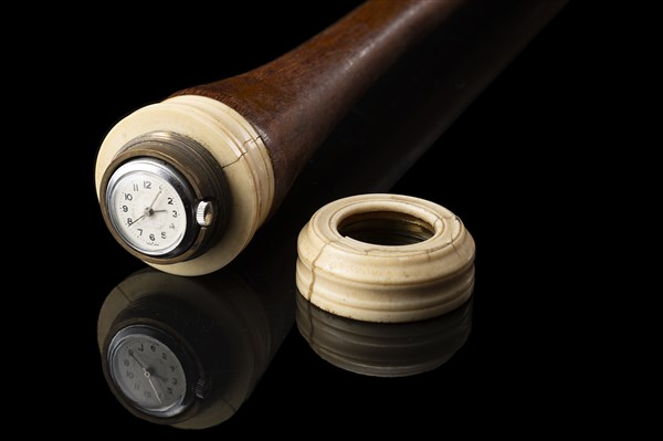 Bastone in malacca con pomo in avorio tornito con porta orologio da tasca con numeri arabi. Puntale in metallo. Secolo XIX. Orologio di epoca posteriore (L. cm 86) (difetti)