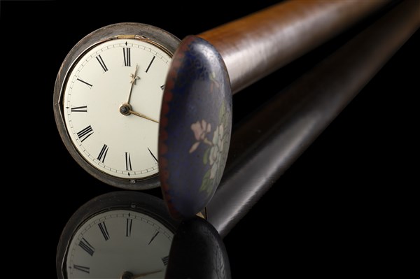 A malacca walking stick with gilded metal mounts and cloisonné enamelled handle enclosing a pocket watch (L. cm 93)