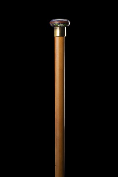 Bastone in malacca con ghiera in metallo dorato e pomo apribile in smalto clois