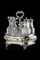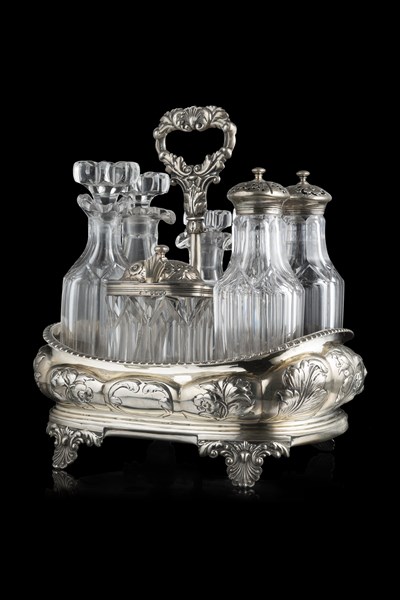 Cruet in argento sbalzato a fiori e volute, presa ad anello e piedini a valva di conchiglia, sette ampolle in cristallo Londra, 1835. Argentiere George Frederick Pinnel (cm 18x22x13,5) (g lordi 420) (difetti)