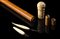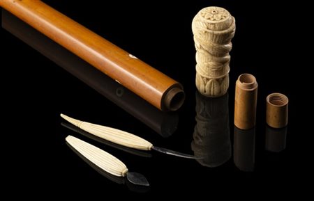 Bastone in malacca con passa laccio e presa in avorio intagliato a serpente avviluppato, contenente un porta aghi in legno e due strumenti in avorio e acciaio. Secolo XIX (L. cm 101)