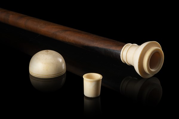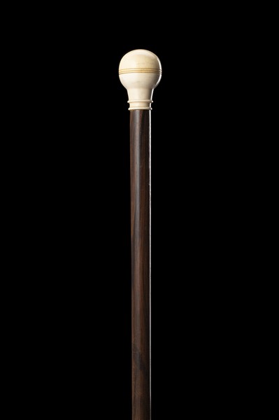 Bastone da signora in malacca con presa in avorio tornito di forma sferica svitabile e celante ditale in avorio. Secolo XIX (L. cm 93)