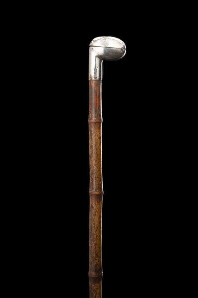 Bastone porta pipa in bambù con presa e ghiera in argento. Punzoni di Birmingham, argentiere J.B. Puntale in metallo (L. cm 87) (difetti)