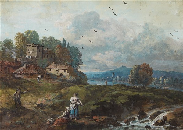 Lotto 750 | Scuola della fine del secolo XVIII - inizio XIX Paesaggio con figure presso un