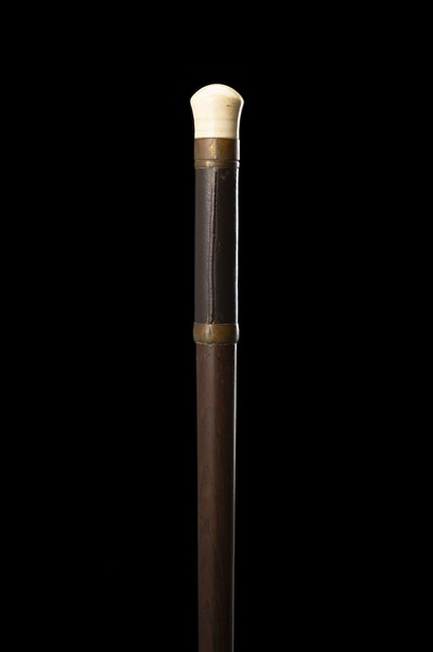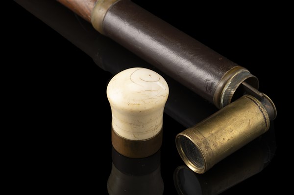 Bastone da marina in malacca con presa in avorio tornito celante cannocchiale a scomparsa. Ghiera e impugnatura in bronzo e cuoio. Puntali in corno. Inghilterra, inizio secolo XX (L. cm 93)