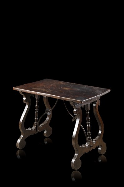 Tavolino in legno intagliato con gambe a lira sagomate, montanti torniti e traverse in ferro battuto (cm 66,54,5x42,5) (difetti)