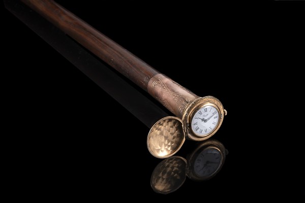 A malacca walking stick with gilded metal handle enclosing a French Barillet watch. Metal mount (L. cm 92) (defects)