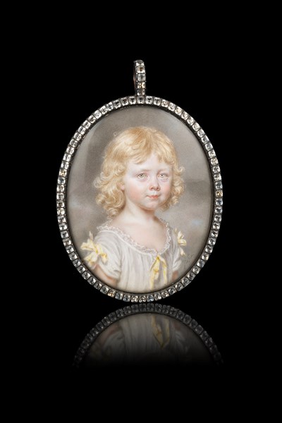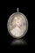 Artista del secolo XVIII "Ritratto di fanciulla" miniatura, siglata e datata 1791 in basso a destra. In cornice in argento a ciondolo rifinito in paste vitree (cm 7x6)