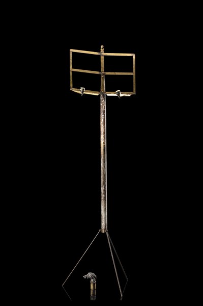 Bastone da musicista in metallo laccato, presa a guisa di testa di cane. Contenente all'interno portaspartito in ottone. Secolo XIX (L. cm 89) (difetti)