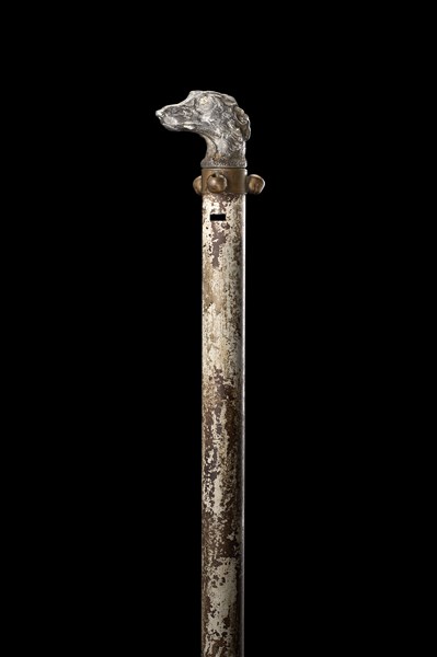 Bastone da musicista in metallo laccato, presa a guisa di testa di cane. Conten