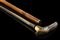 Bastone in bambù con presa in corno di cervo celante ippometro per misurare il garrese del cavallo in ottone e metallo. Ghiera in oro basso con puntale in metallo (L. cm 95)