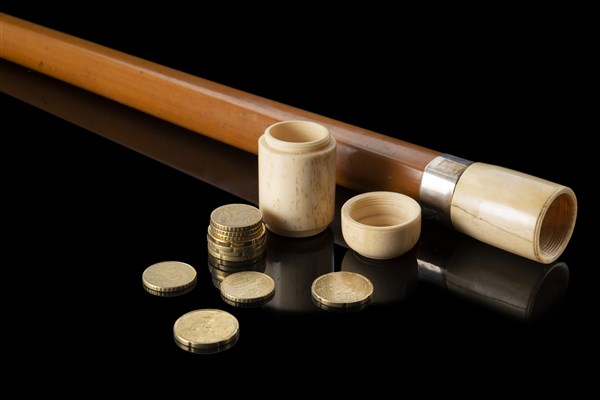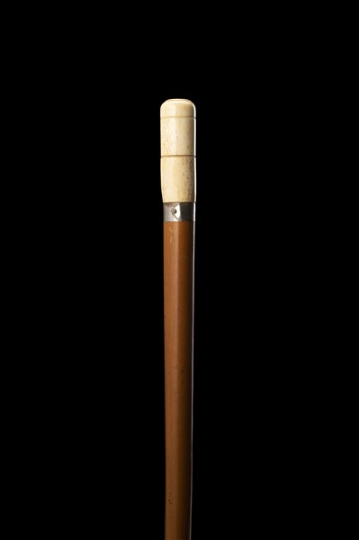 Bastone in malacca con presa in osso smontabile in due parti ed utilizzabile come portamonete. Secolo XIX (L. cm 88)