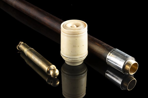 Bastone in malacca con pomolo in avorio tornito svitabile celante bilancia in ottone. Ghiera in argento e puntale in metallo dorato. Inghilterra, secolo XX (L. cm 97) (difetti)