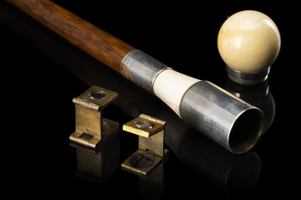 An early 20th-century English malacca walking stick with silver and ivory handle enclosing two goldsmith lenses (L. cm 92) (defects)