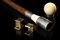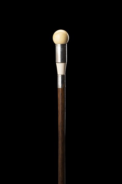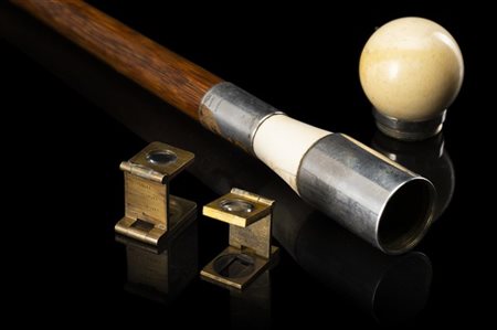 Bastone in malacca con presa in argento e avorio tornito celante due piccole lenti da orafo. Inghilterra, inizio secolo XX (L. cm 92) (difetti)