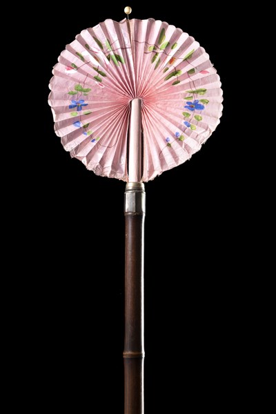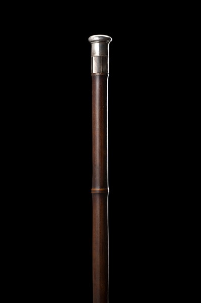 Bastone in bambù con presa in argento e ghiera ricoperta di madreperla celante un ventaglio dipinto con pagine in carta entro astuccio cilindrico in avorio. Secolo XIX (L. cm 95)