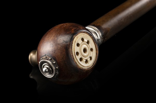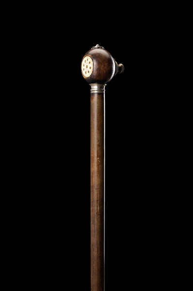 Bastone in legno con presa fischietto a sirena sferico con applicazioni in ottone e avorio. Ghiera in argento inglese. Punzoni di Birmingham, 1872. Argentiere Frederick Elkinton. Puntale in ottone (L. cm 93)
